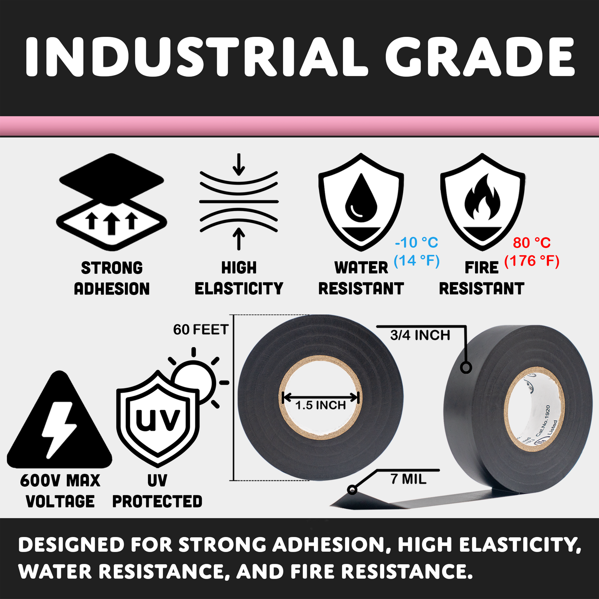 • EXCELLENT VALUE FOR MONEY: Each tape measures 60 feet by ¾ inches and is 7 mm thick. Every package comes with 10 individually wrapped rolls of electric tape.