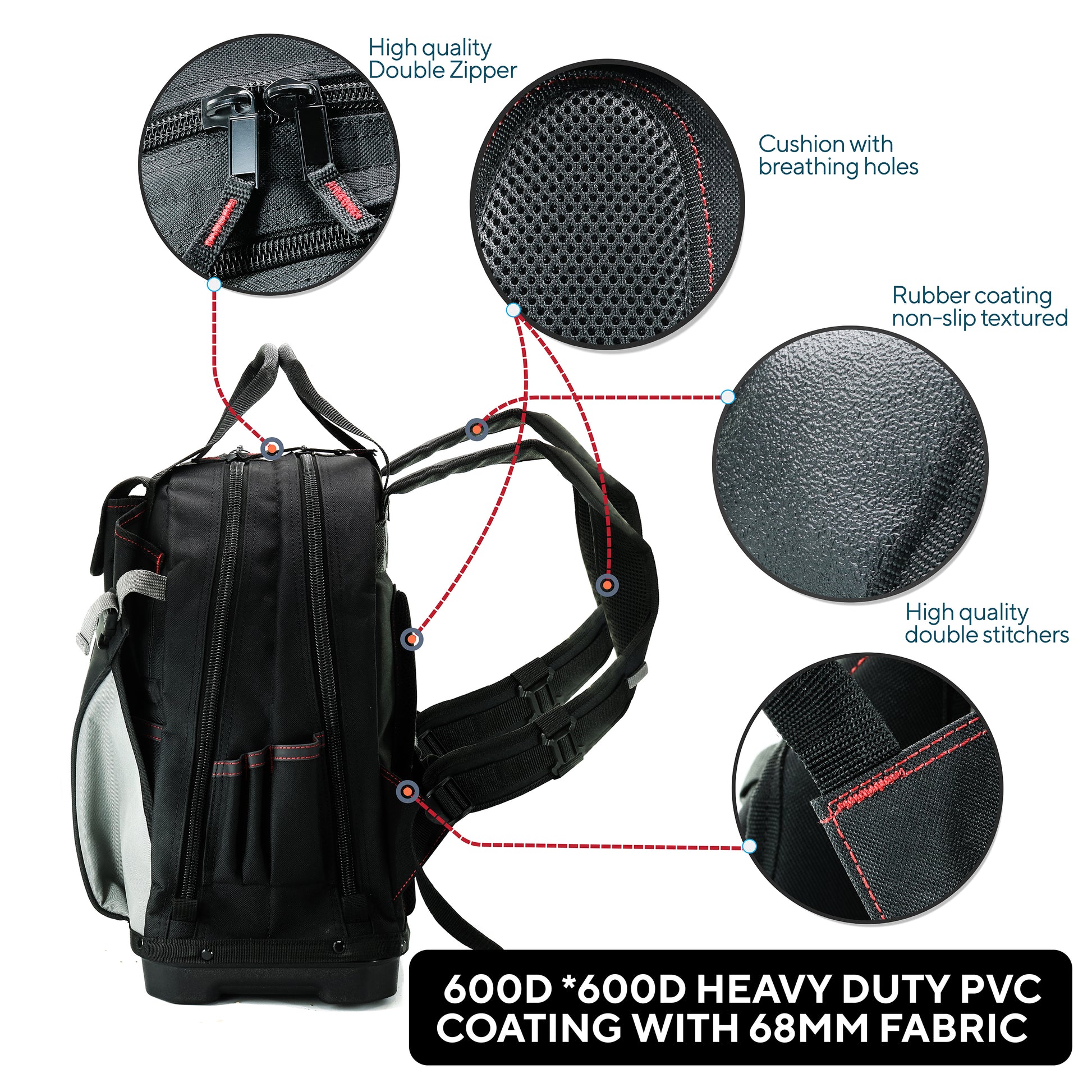 • BALLISTIC PROTECTION: Made with 600Dx600D heavy-duty PVC coating for tear-resistant non-slip texture, this tool backpack is sturdy for extra support. Nothing goes in or out once securely zipped.